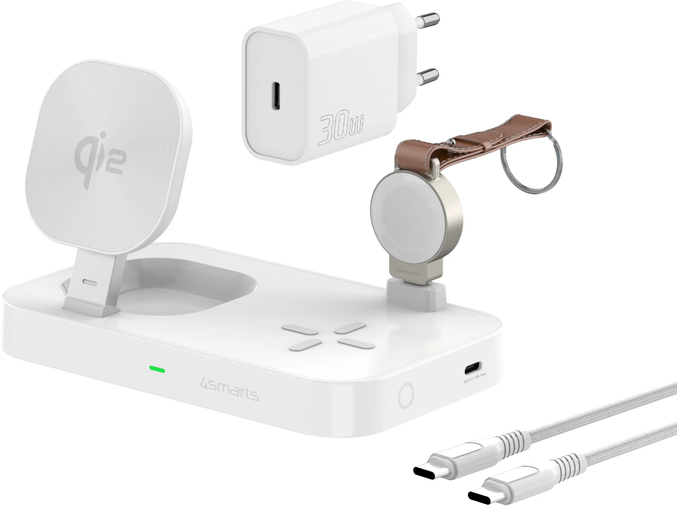 Unser 3-in-1 MagSafe Ladeständer liefert maximale Leistung für drei Geräte gleichzeitig. Im Lieferumfang enthalten ist ein kraftvolles 30W Netzteil samt USB-C-Kabel, um ein schnelles und effizientes Laden zu gewährleisten. Diese Komplettlösung erspart dir den Kauf eines zusätzlichen Adapters. So kannst du deine Geräte direkt nach dem Auspacken aufladen.