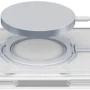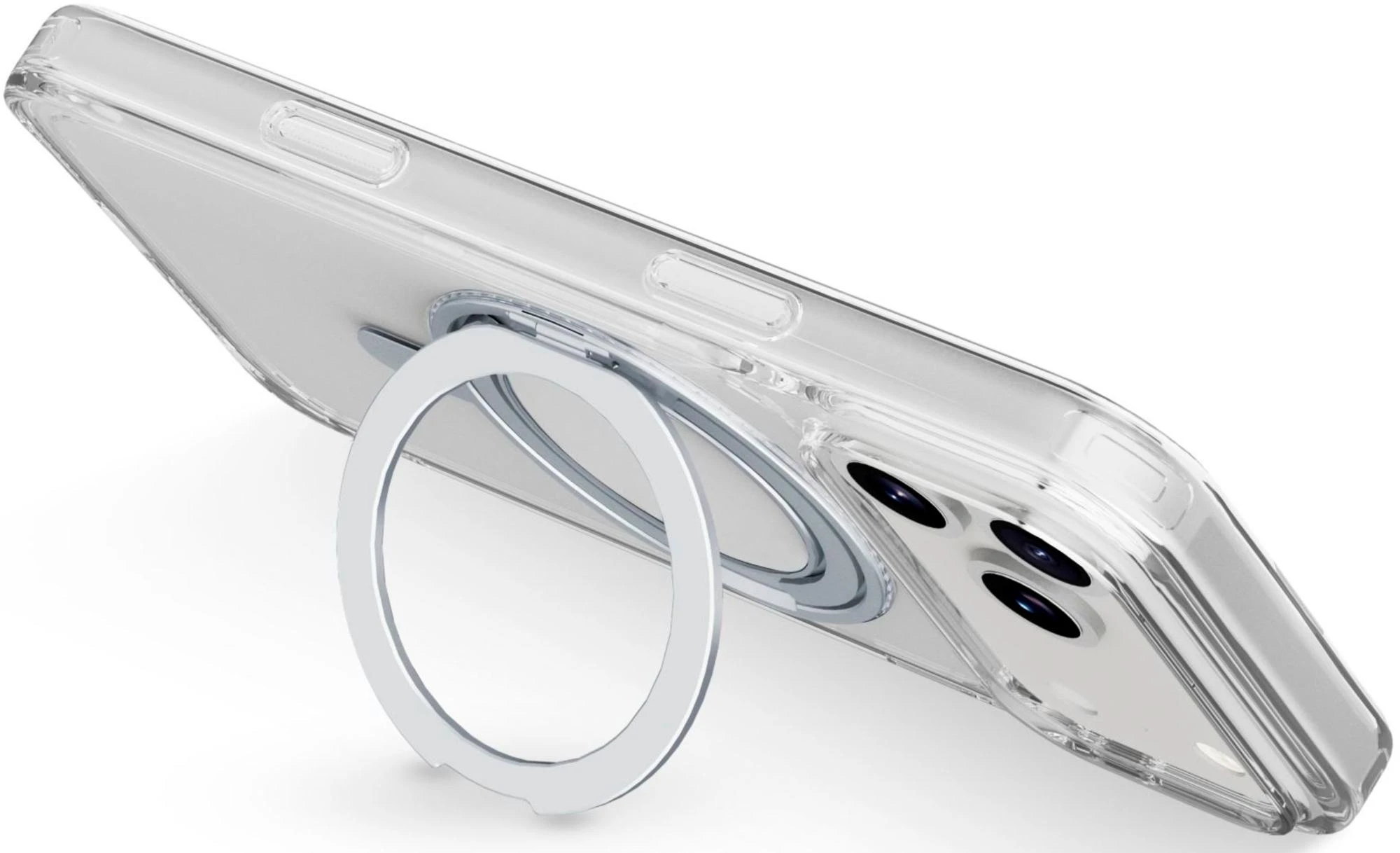 SPIN MAG ist die transparente Hülle mit drehbarem Ständer, die mit dem MagSafe-System kompatibel ist. Es zeichnet sich durch einen um 360 Grad drehbaren Ring aus, der es dem Gehäuse ermöglicht, verschiedene Funktionen wie Stand- und Halterungsfunktionen zu übernehmen. Der Ring ist integriert und wird bei Nichtgebrauch zu einem integralen Bestandteil des Gehäuses, sodass es mit MagSafe-Zubehör kompatibel ist. Die erhöhten Kanten rund um das Display und die Kamerabereiche schützen das Telefon vor versehentlichen Stößen und Stürzen.